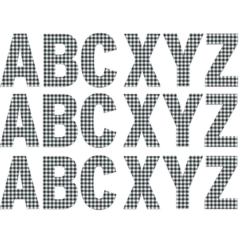 Use Eureka School Jumbo Deco Letters come in fun, trendy patterns that will add a touch of color to any bulletin board or wall. Look for coordinating Extra Wide Deco Trim! Each punch-out, reusable jumbo letter measures 7", printed on long-lasting coated paper. Each pack contains 129 characters. Black & White Gingham. Sold as 3 packs for a total of 387 characters.