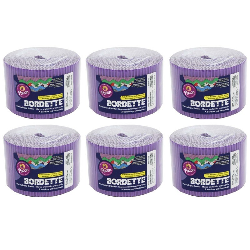 Bordette® is the original, pre-scalloped, fade-resistant decorative border. The sturdy corrugate provides a unique 3-dimensional appearance on any flat surface. It bends, molds, turns and twists to create unique layered designs. Packaged in a perforated roll, Bordette is easy to separate. It's easy to mix and match colors to create the perfect display. One 50' roll of Bordette will completely edge two 8' x 4' bulletin boards. Recyclable. Each roll includes 2.25" x 50'. Sold as a pack of 6 rolls.