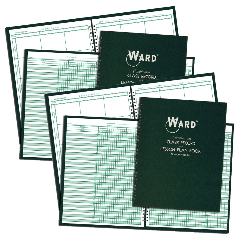 Ward Combination Class Record Book/Lesson Plan Book includes 9-10 week grading period with 38 student names per page. Four grading periods with grading sheets for 36 to 40 weeks of school and 16 classes per year. Six period plan book covering a school year up to 40 weeks. Each week divided into a five day week with 6 periods per day. Includes memorandum sheets and seating charts. Sold as a pack of 2 books.