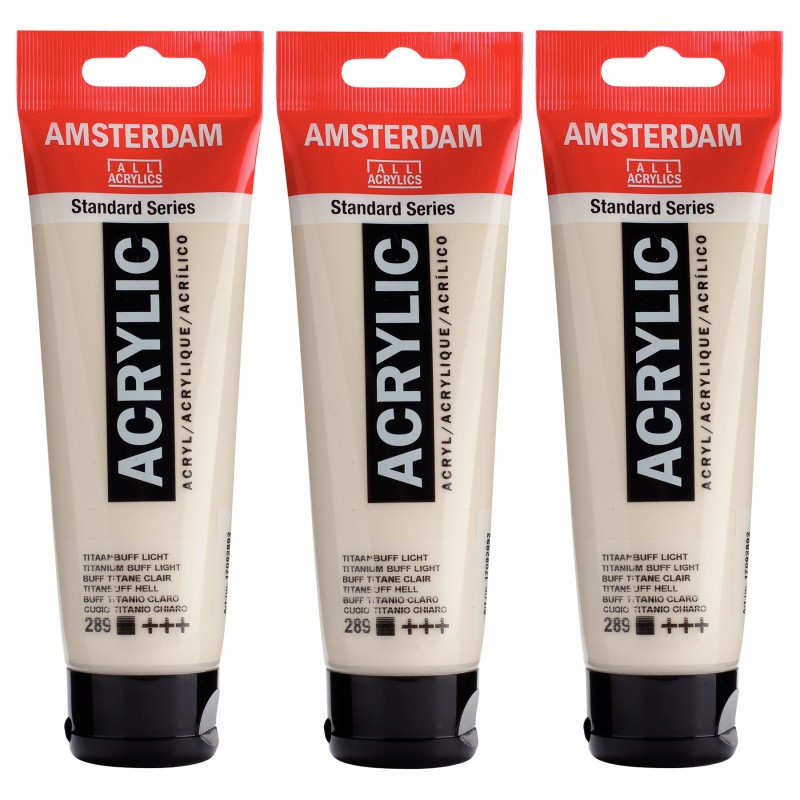 Amsterdam Standard Series acrylic paint in Titanium Buff Light (289) is an opaque color with an excellent lightfastness. Our Standard Series offers you the broadest range of remarkably vibrant acrylic colors. This versatile paint is easy to work with and offers a smooth application. Use the paint straight from the tube or thinned with a little bit of water or one of our acrylic mediums. Medium viscosity paint for visible brush strokes, texture and smooth coverage with a satin finish. Made with high-quality, lightfast pigments. Formulated with 100% acrylic resin binder, resulting in an exceptionally durable and flexible paint film with a uniform degree of gloss. Odorless, water-based formula that becomes waterproof and permanent when dry. Extensive range of 102 colors available in 20ml and 120ml tubes, of which up to 90 colors are also available in larger sizes. The range of colors includes both traditional and modern colors such as reflex and metallic variants. Adheres to virtually any slightly porous surface, including canvas, paper, cardboard, wood, stone and cement. Proudly crafted in the Netherlands. Sold as a pack of 3.