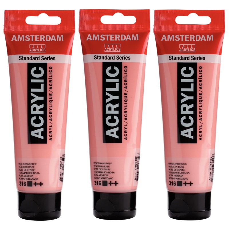 Amsterdam Standard Series acrylic paint in Venetian rose (316) is an opaque color with a very good lightfastness (++). Our Standard Series offers you the broadest range of remarkably vibrant acrylic colors. This versatile paint is easy to work with and offers a smooth application. Use the paint straight from the tube or thinned with a little bit of water or one of our acrylic mediums. Medium viscosity paint for visible brush strokes, texture and smooth coverage with a satin finish. Made with high-quality, lightfast pigments. Formulated with 100% acrylic resin binder, resulting in an exceptionally durable and flexible paint film with a uniform degree of gloss. Odorless, water-based formula that becomes waterproof and permanent when dry. Extensive range of 102 colors available in 20ml and 120ml tubes, of which up to 90 colors are also available in larger sizes. The range of colors includes both traditional and modern colors such as reflex and metallic variants. Adheres to virtually any slightly porous surface, including canvas, paper, cardboard, wood, stone and cement. Proudly crafted in the Netherlands. Sold as a pack of 3.