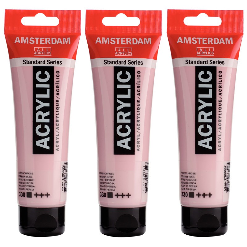 Amsterdam Standard Series acrylic paint in Persian Rose (330) is an opaque color with an excellent lightfastness. Our Standard Series offers you the broadest range of remarkably vibrant acrylic colors. This versatile paint is easy to work with and offers a smooth application. Use the paint straight from the tube or thinned with a little bit of water or one of our acrylic mediums. Medium viscosity paint for visible brush strokes, texture and smooth coverage with a satin finish. Made with high-quality, lightfast pigments. Formulated with 100% acrylic resin binder, resulting in an exceptionally durable and flexible paint film with a uniform degree of gloss. Odorless, water-based formula that becomes waterproof and permanent when dry. Extensive range of 102 colors available in 20ml and 120ml tubes, of which up to 90 colors are also available in larger sizes. The range of colors includes both traditional and modern colors such as reflex and metallic variants. Adheres to virtually any slightly porous surface, including canvas, paper, cardboard, wood, stone and cement. Proudly crafted in the Netherlands. Sold as a pack of 3.
