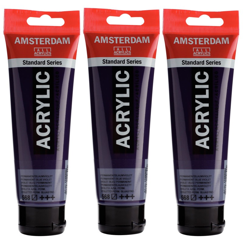 Amsterdam Standard Series acrylic paint in Permanent Blue Violet (568) is a semi-transparent color with an excellent lightfastness. Our Standard Series offers you the broadest range of remarkably vibrant acrylic colors. This versatile paint is easy to work with and offers a smooth application. Use the paint straight from the tube or thinned with a little bit of water or one of our acrylic mediums. Medium viscosity paint for visible brush strokes, texture and smooth coverage with a satin finish. Made with high-quality, lightfast pigments. Formulated with 100% acrylic resin binder, resulting in an exceptionally durable and flexible paint film with a uniform degree of gloss. Odorless, water-based formula that becomes waterproof and permanent when dry. Extensive range of 102 colors available in 20ml and 120ml tubes, of which up to 90 colors are also available in larger sizes. The range of colors includes both traditional and modern colors such as reflex and metallic variants. Adheres to virtually any slightly porous surface, including canvas, paper, cardboard, wood, stone and cement. Proudly crafted in the Netherlands. Sold as a pack of 3.