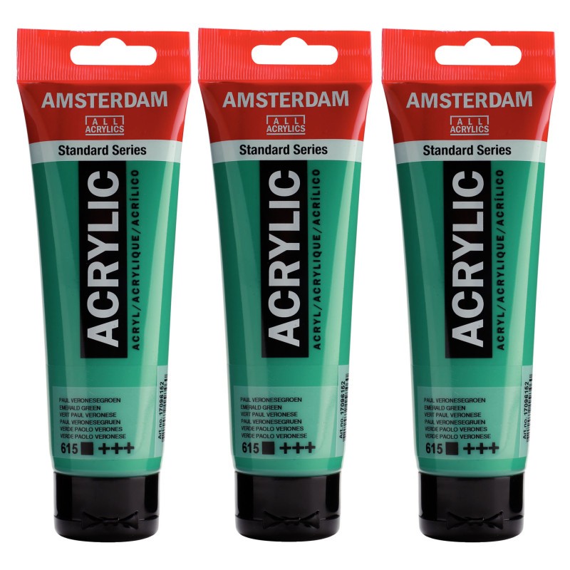 Amsterdam Standard Series acrylic paint in Emerald Green (615) is an opaque color with an excellent lightfastness. Our Standard Series offers you the broadest range of remarkably vibrant acrylic colors. This versatile paint is easy to work with and offers a smooth application. Use the paint straight from the tube or thinned with a little bit of water or one of our acrylic mediums. Medium viscosity paint for visible brush strokes, texture and smooth coverage with a satin finish. Made with high-quality, lightfast pigments. Formulated with 100% acrylic resin binder, resulting in an exceptionally durable and flexible paint film with a uniform degree of gloss. Odorless, water-based formula that becomes waterproof and permanent when dry. Extensive range of 102 colors available in 20ml and 120ml tubes, of which up to 90 colors are also available in larger sizes. The range of colors includes both traditional and modern colors such as reflex and metallic variants. Adheres to virtually any slightly porous surface, including canvas, paper, cardboard, wood, stone and cement. Proudly crafted in the Netherlands. Sold as a pack of 3.