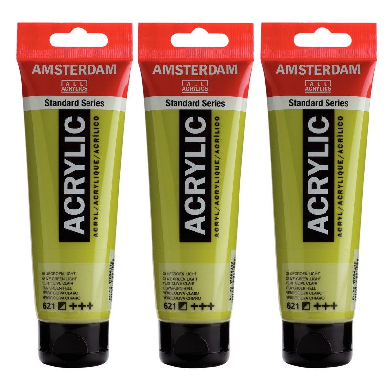 Amsterdam Standard Series acrylic paint in Olive Green Light (621) is a semi-opaque color with an excellent lightfastness. Our Standard Series offers you the broadest range of remarkably vibrant acrylic colors. This versatile paint is easy to work with and offers a smooth application. Use the paint straight from the tube or thinned with a little bit of water or one of our acrylic mediums. Medium viscosity paint for visible brush strokes, texture and smooth coverage with a satin finish. Made with high-quality, lightfast pigments. Formulated with 100% acrylic resin binder, resulting in an exceptionally durable and flexible paint film with a uniform degree of gloss. Odorless, water-based formula that becomes waterproof and permanent when dry. Extensive range of 102 colors available in 20ml and 120ml tubes, of which up to 90 colors are also available in larger sizes. The range of colors includes both traditional and modern colors such as reflex and metallic variants. Adheres to virtually any slightly porous surface, including canvas, paper, cardboard, wood, stone and cement. Proudly crafted in the Netherlands. Sold as a pack of 3.