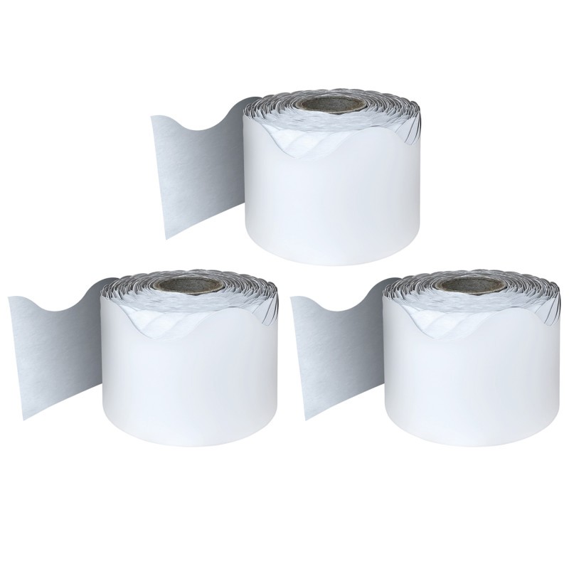 Carson Dellosa's White Scalloped Bulletin Board Border brings added style to your classroom, dorm room, party, daycare, or homeschool setting. This set includes one roll of classic white bulletin board border trim printed on thick but flexible paper that can be used for solo displays or multiple learning visuals. Decorate your learning space with a single layer border, or add layers to create dimension to your displays. The border is great as an accent color or pop of brightness for any standard visual or decorative display. For a cohesive theme, check out coordinating Carson Dellosa teaching supplies and classroom decorations. Education happens everywhere, and Carson Dellosa strives to provide the tools needed to inspire learning everywhere it happens. Each rolled border measures 2 1/4 inches by 65 feet to decorate bulletin boards, desks, classroom walls, lockers, and more with ease. Sold as a pack of 3 rolls.