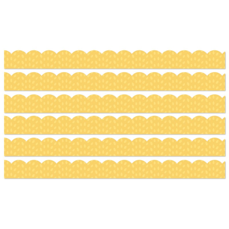 Bring thoughts of warmth and whimsy into your classroom with the calming shades of the Carson Dellosa Grow Together Yellow Bulletin Board Borders! Each pack includes 13 strips of scalloped bulletin board borders with a yellow painted polka dot design. Each bulletin board border strip measures 3 feet x 3 inches for a total of 39 feet—perfect for white board, cork board, and other colorful décor needs. Cut and layer the bulletin board border to add dimension to any display with ease. Add yellow bulletin board borders to locker and desk décor, and other classroom décor or office décor, or incorporate into spring and summer bulletin board decorations for stylish seasonal displays. Sold as 6 packs for a total of 78 strips (234 feet).